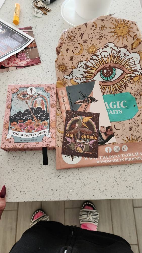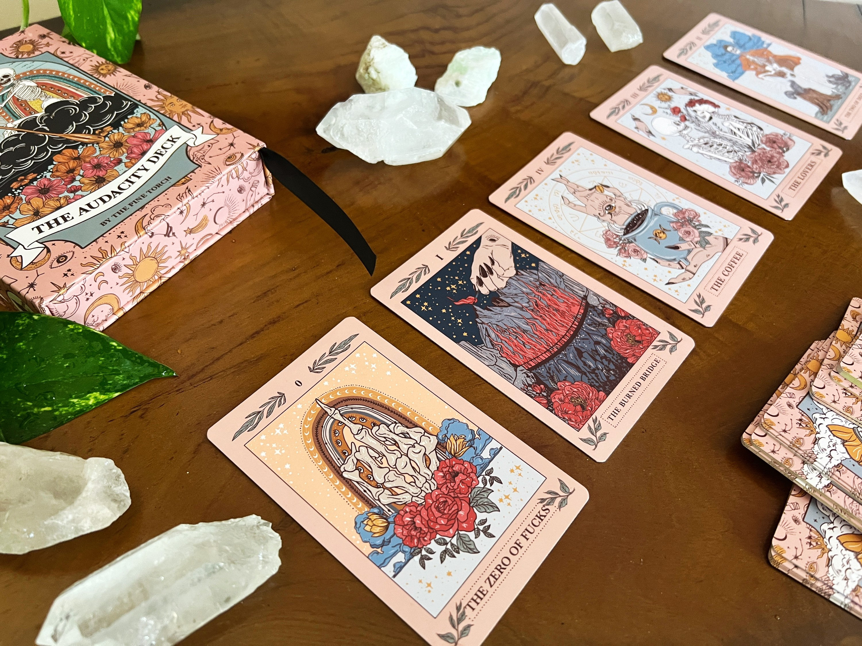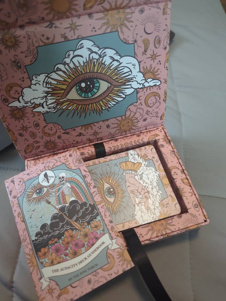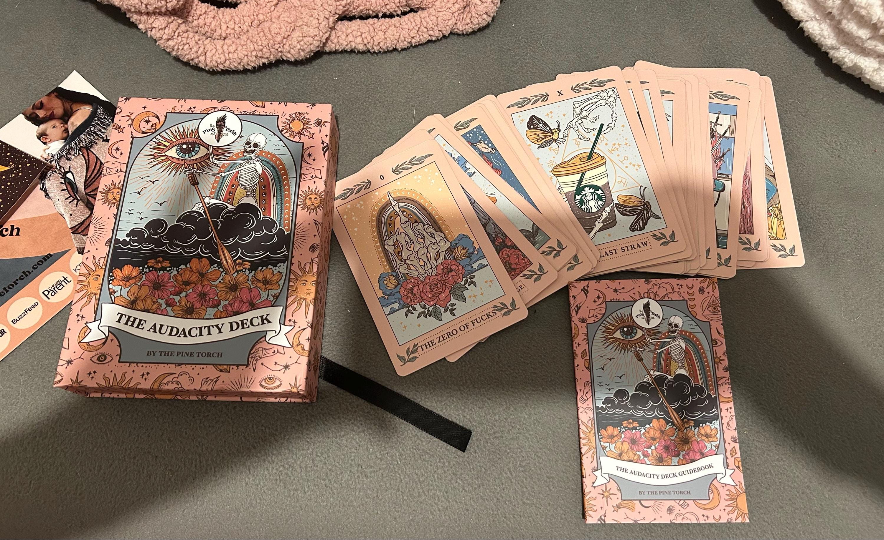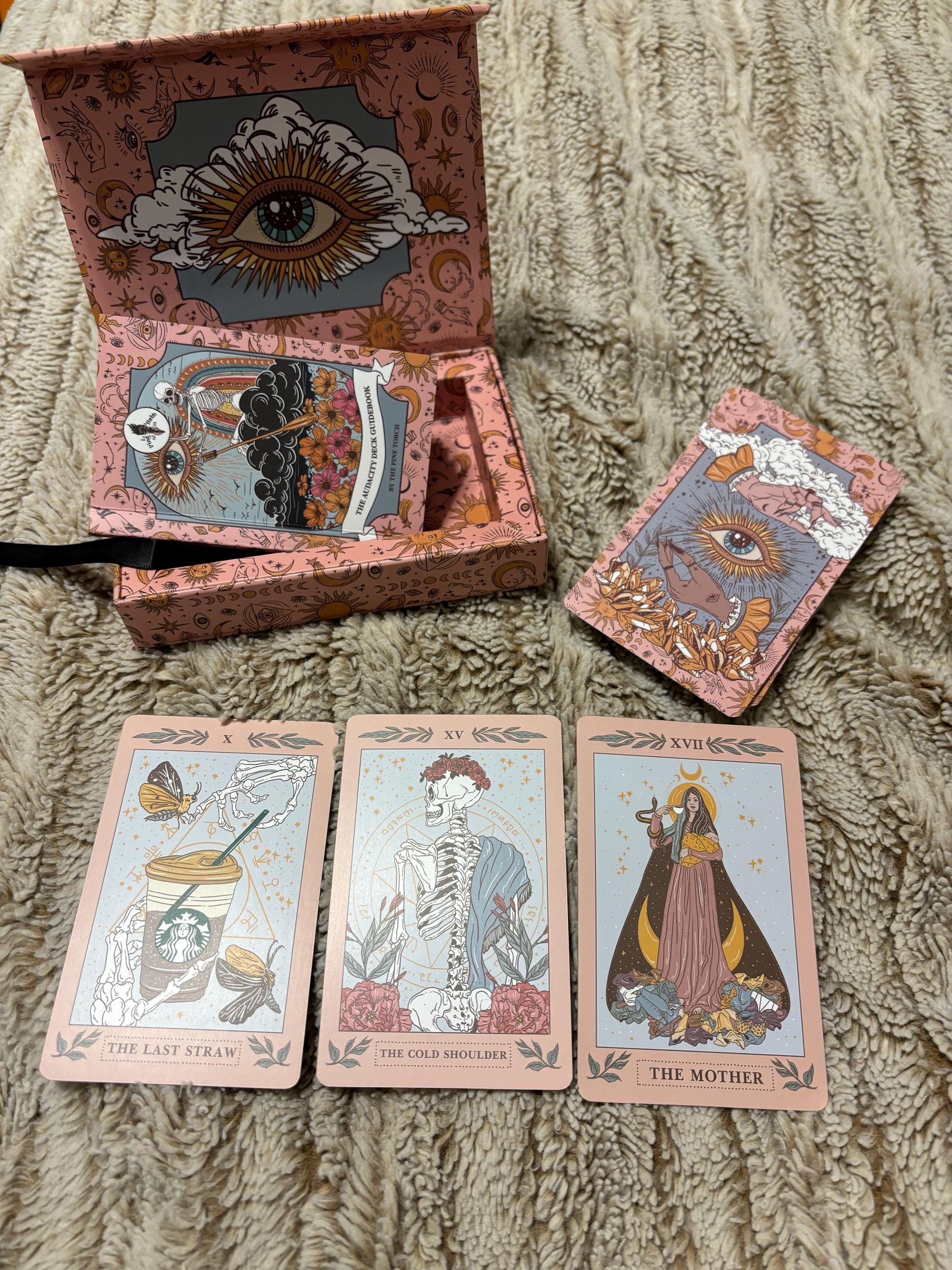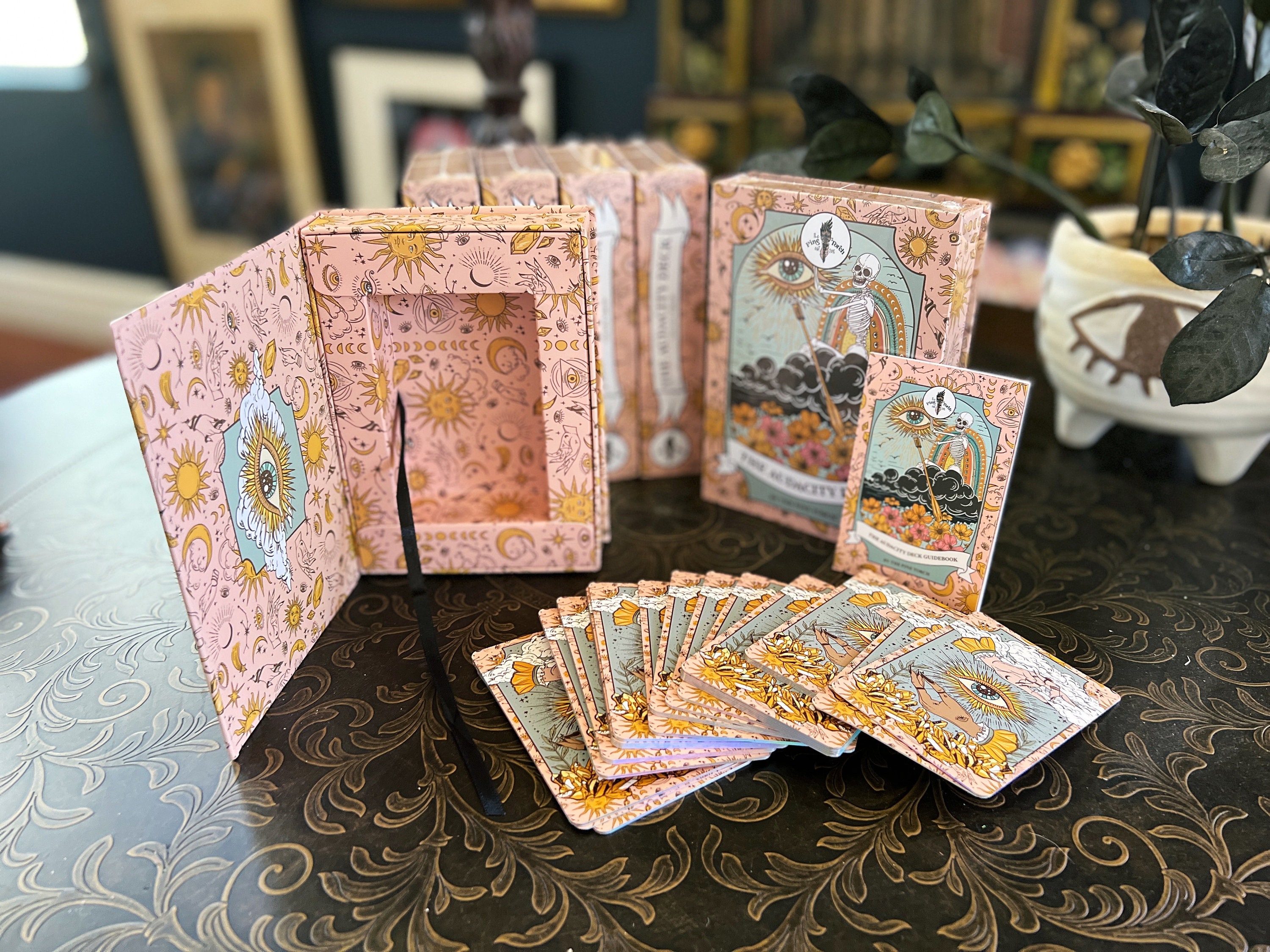 ★One day, as her Boston Terrier, Iggy, was eating her long-awaited McDonald's fries after a particularly rough night, she yelled out her mantra, "Be bold!" to Iggy, and Mari decided at that moment that this would be the perfect Tarot design. What could be the most obnoxious, hilarious illustration of the abstract concept of bold, you might ask? That's where Mari comes in (along with a skeleton rowing through the clouds into a serenely atmospheric and idyllic world, about to cause some debauchery). Her Tarot collection was first made into t-shirts and blankets, then received countless requests for it, and eventually it emerged into the ether as if it had its own soul and ectoplasm.
