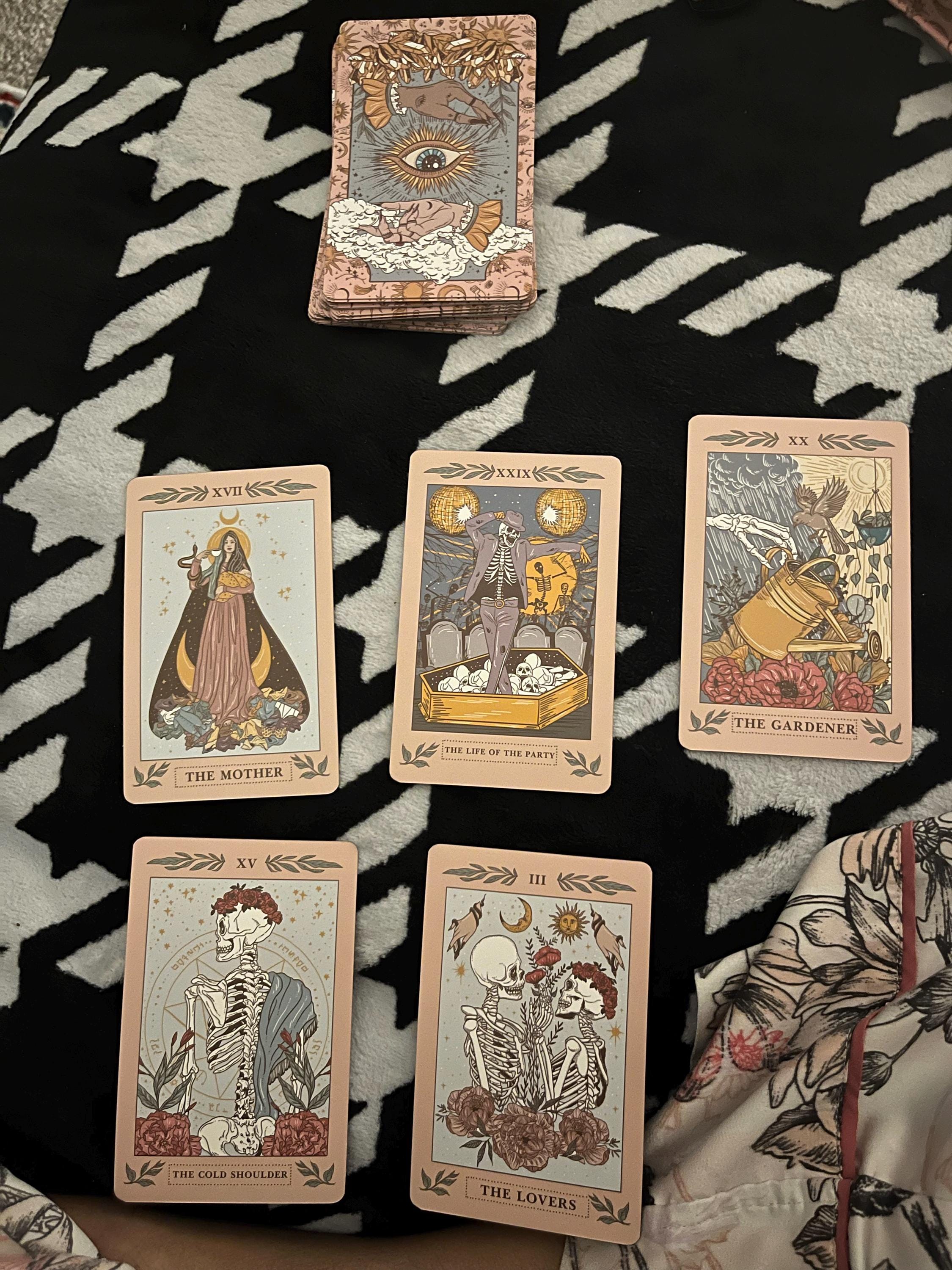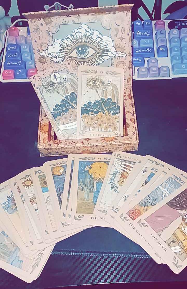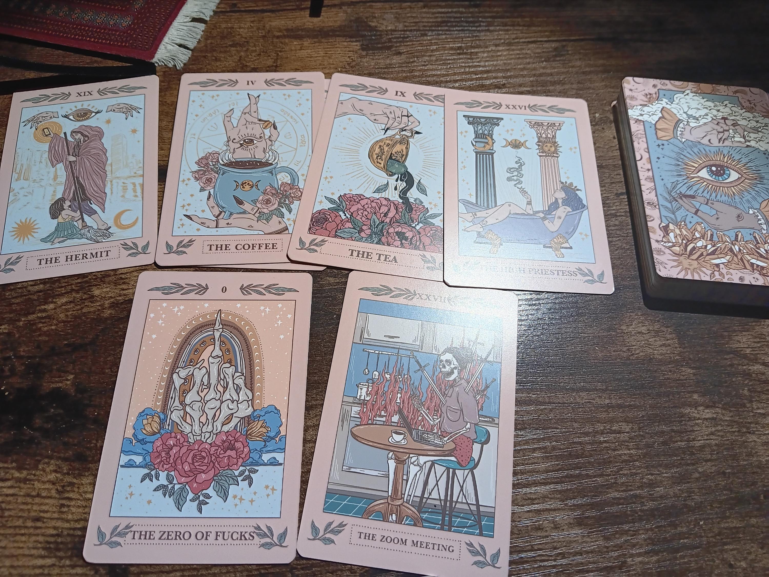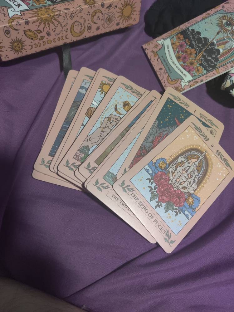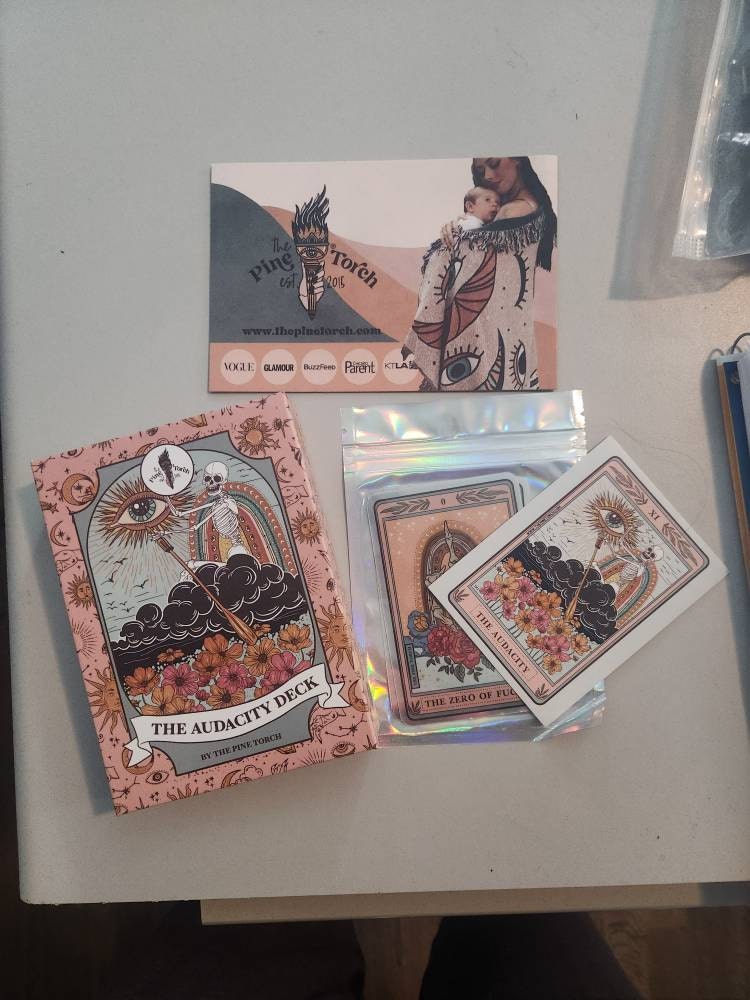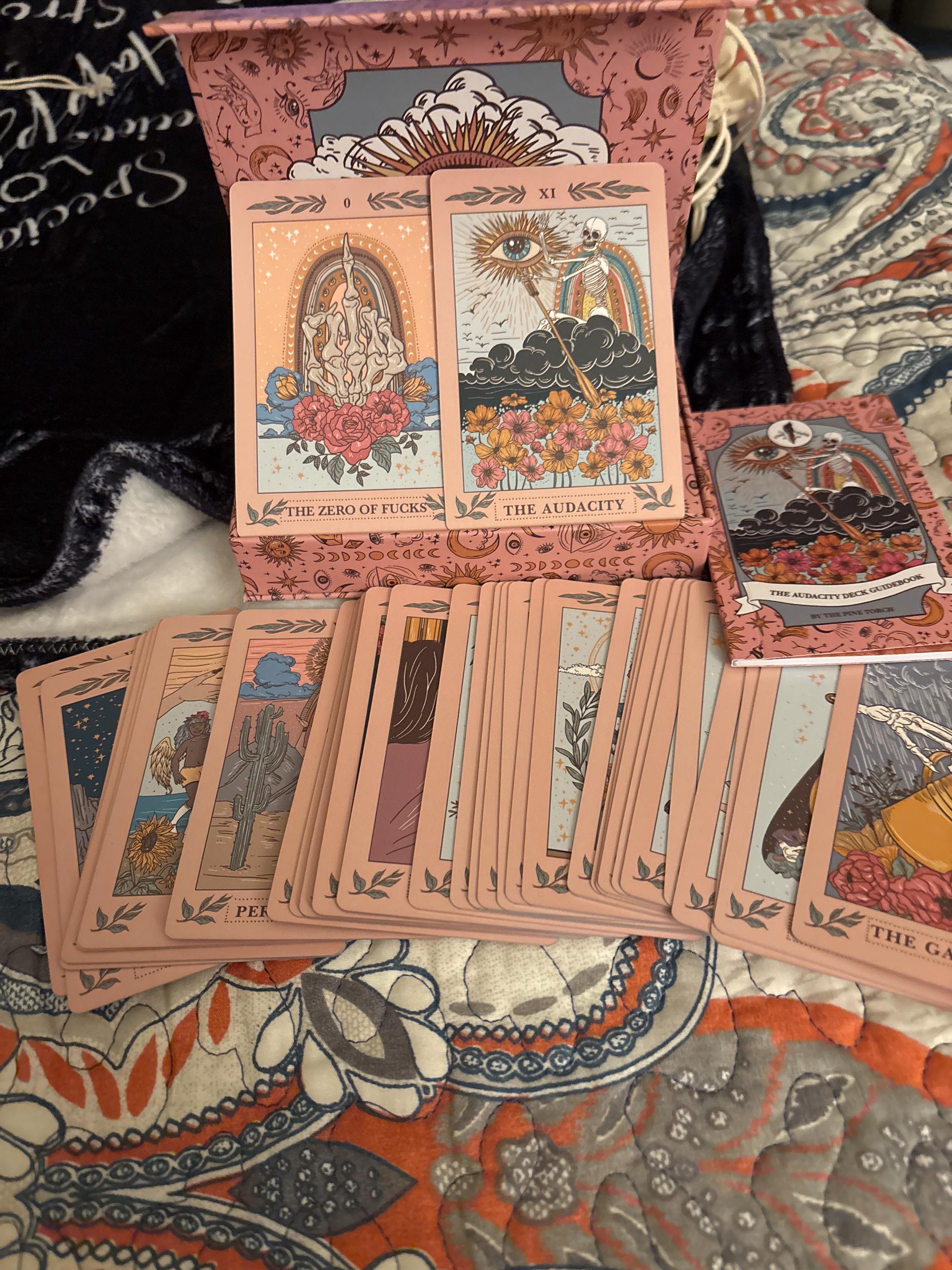 ★One day, as her Boston Terrier, Iggy, was eating her long-awaited McDonald's fries after a particularly rough night, she yelled out her mantra, "Be bold!" to Iggy, and Mari decided at that moment that this would be the perfect Tarot design. What could be the most obnoxious, hilarious illustration of the abstract concept of bold, you might ask? That's where Mari comes in (along with a skeleton rowing through the clouds into a serenely atmospheric and idyllic world, about to cause some debauchery). Her Tarot collection was first made into t-shirts and blankets, then received countless requests for it, and eventually it emerged into the ether as if it had its own soul and ectoplasm.
